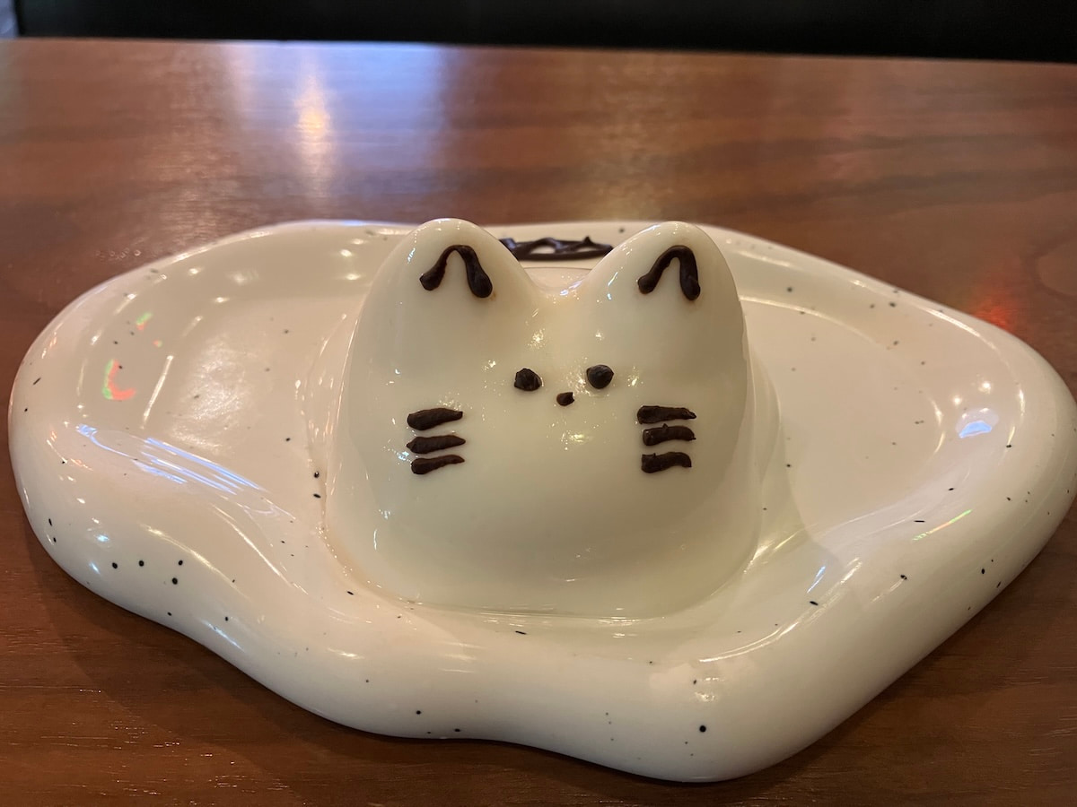 看板メニューのひとつ「ねこプリン」は、どこから食べようか迷ってしまうほどの可愛さ。