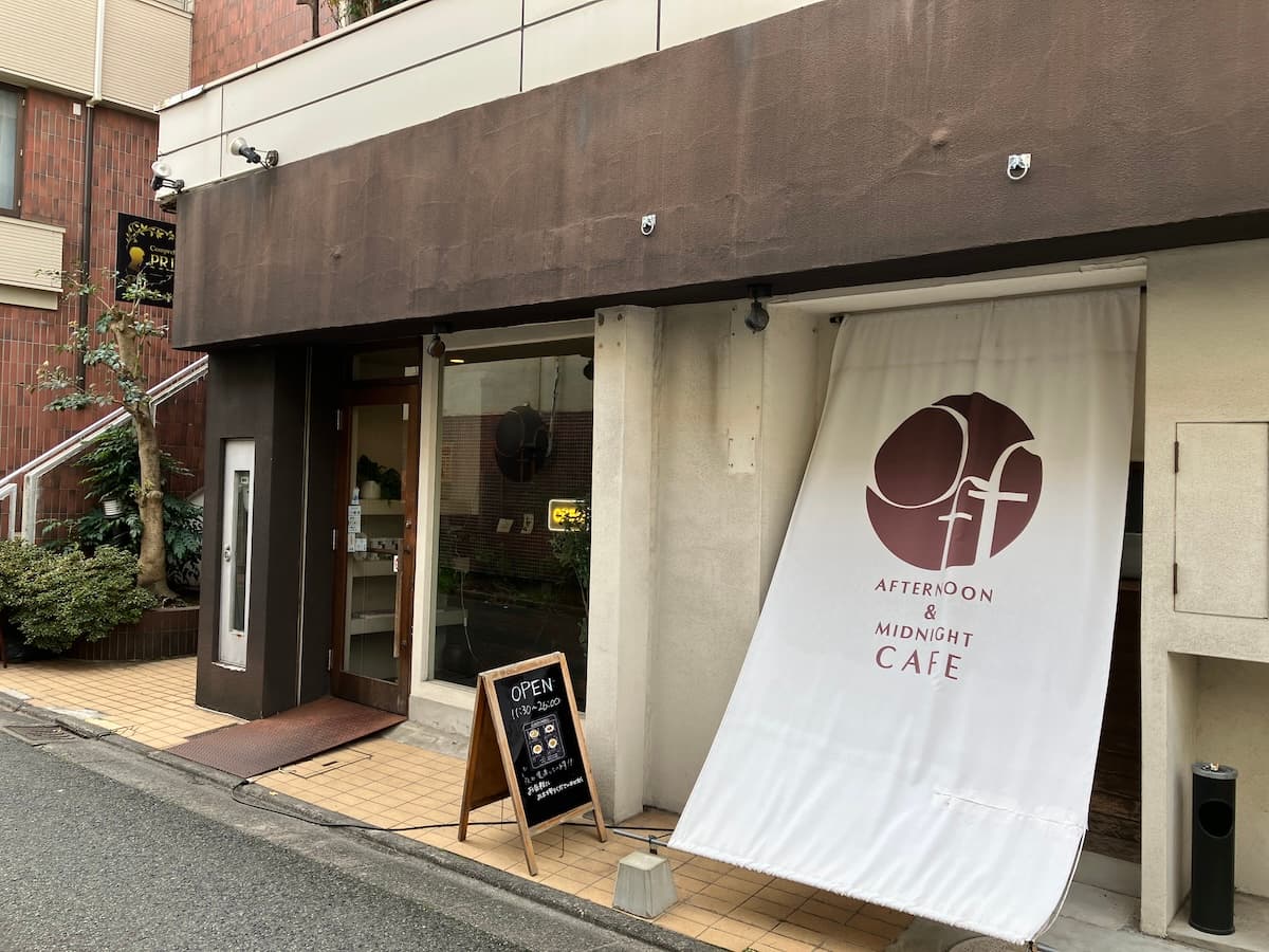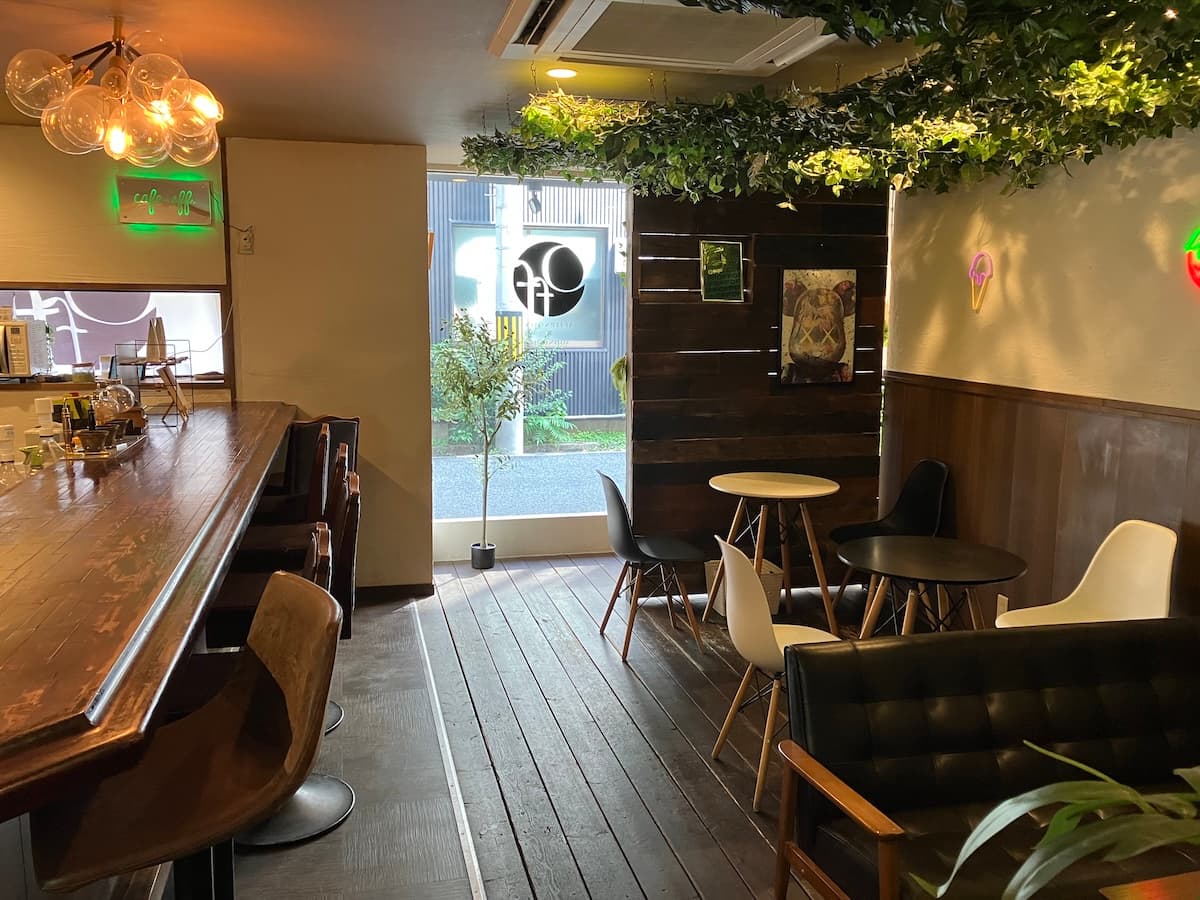 昼はランチやスイーツ、夜は深夜2時まで楽しめる「夜カフェ」として営業。落ち着いた雰囲気の店内にはカウンター席やソファ席があり、ひとりでも友人とでもゆったりと過ごせます。日常から少し離れて、“off”な時間を楽しみたいときにぴったりのカフェです。